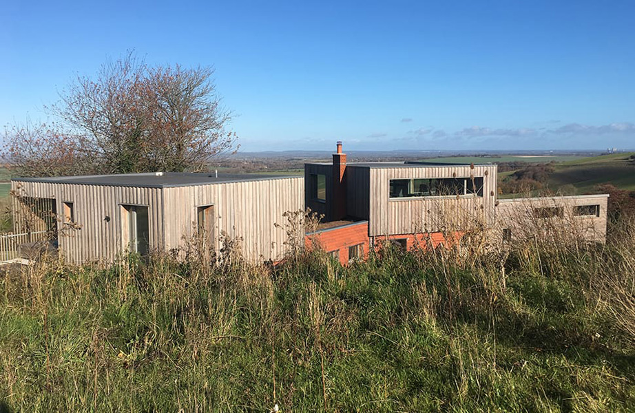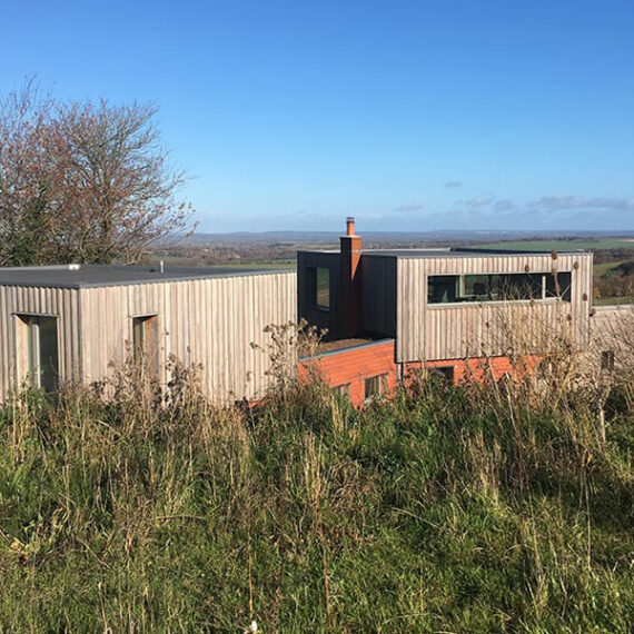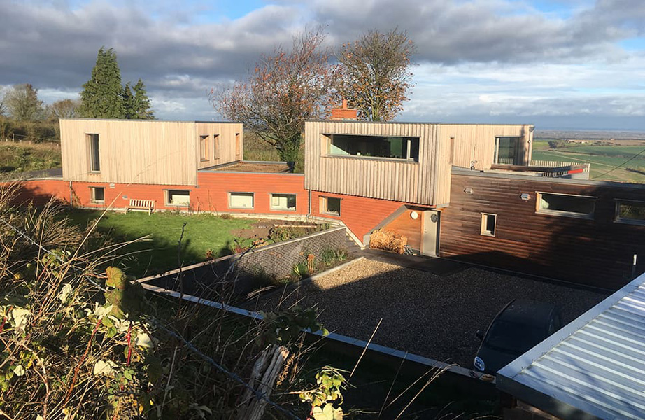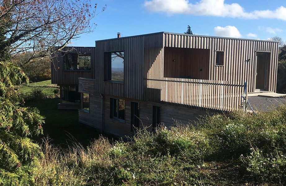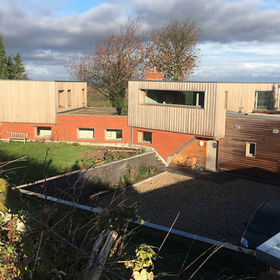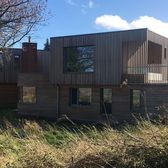 Low energy timber framed house, clad in Larch, Zinc and Peterson Tiles. Zinc, single ply and green roofs. Air source heat pumps and MVHR system.