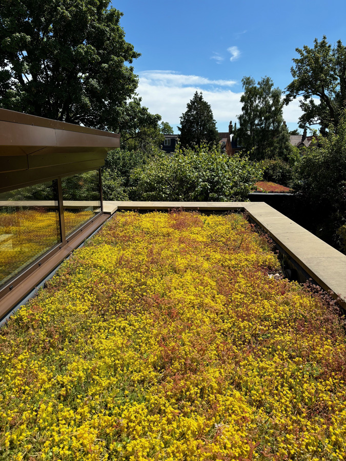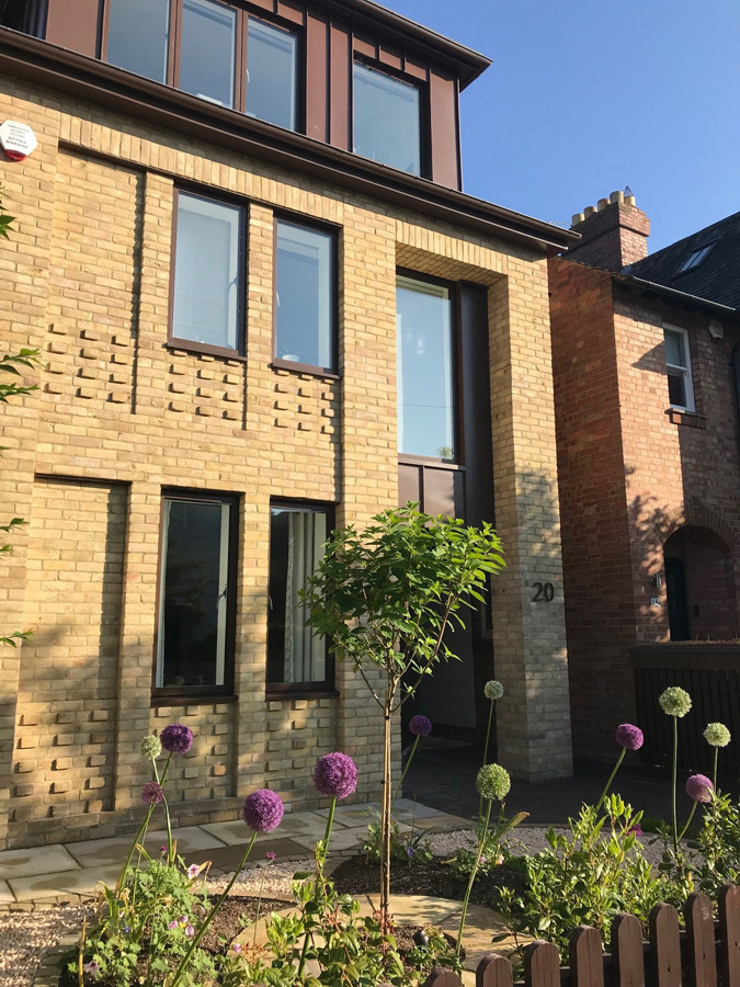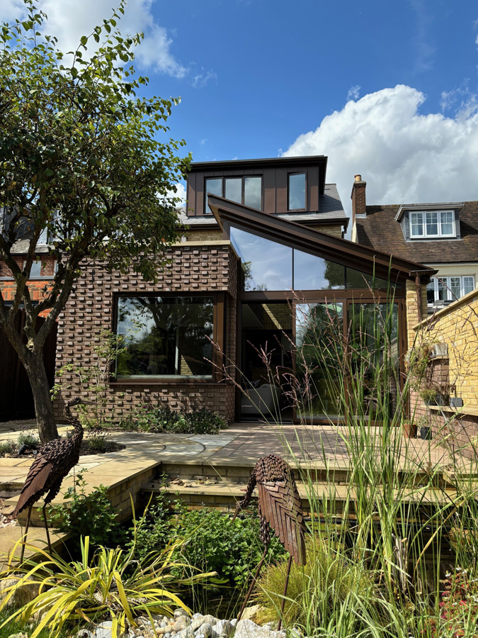 Key features include a technically complex brick façade with dentil and recessed panels, a varied roofscape of slate, zinc, and green roofing, and full-height glazing to the rear that connects to a landscaped terrace. Internally, the home offers light-filled, well-proportioned spaces with bespoke finishes throughout.