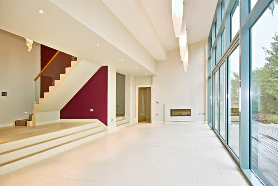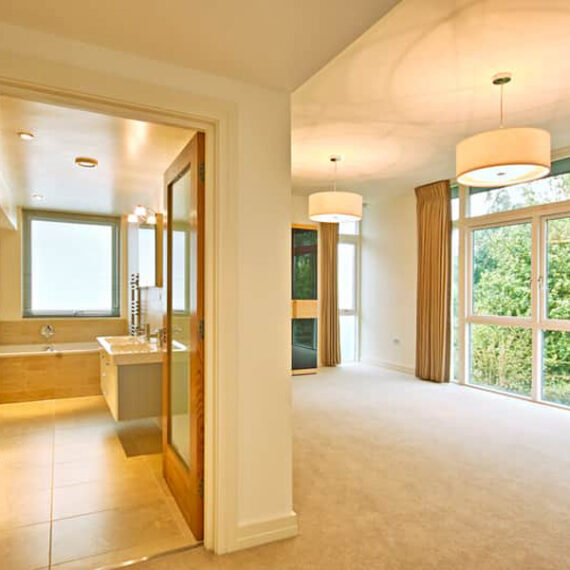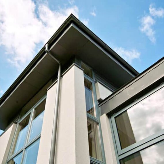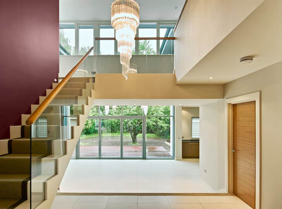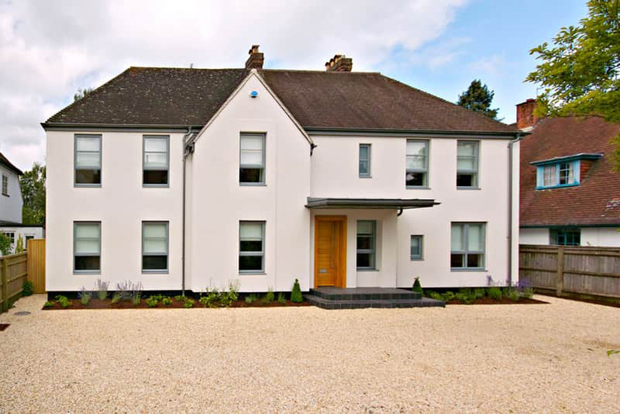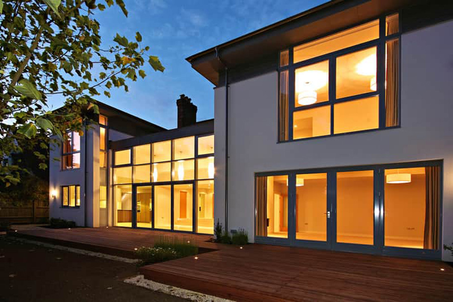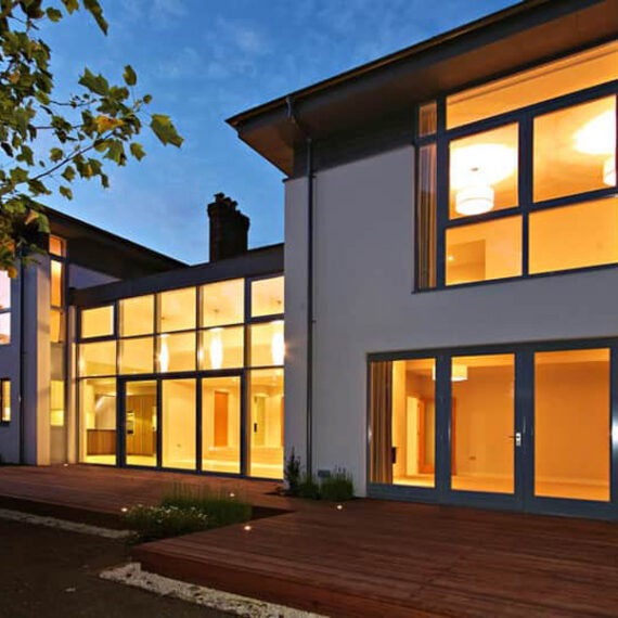 Two storey rear extension. Total refurbishment of existing house. Zinc roof, MVHR, external insulation and render system. Glazed curtain walling.